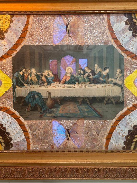 Antique Early 1900’s Last Supper Butterfly Wing Art Carved Wood Frame