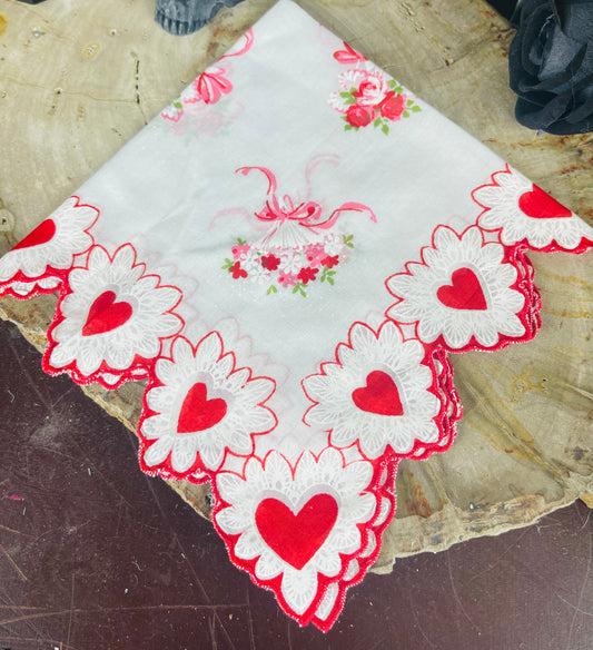 Antique Valentine Flower Bouquets Scalloped Hearts Handkerchief