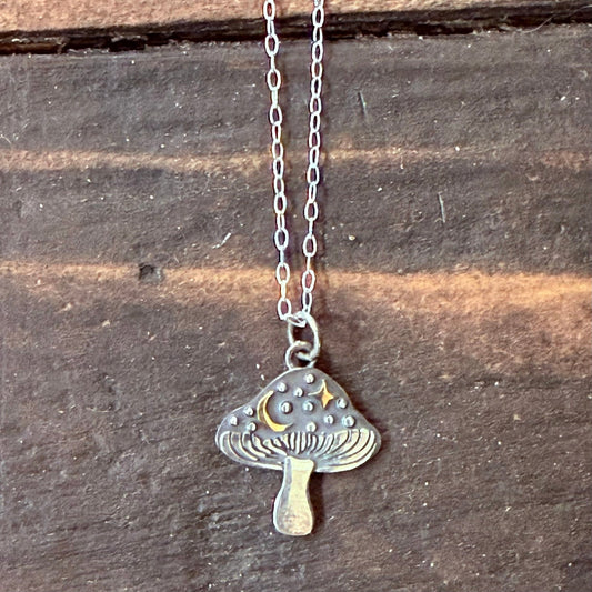 Sterling Amanita Mushroom Gold Moon & Star Necklace