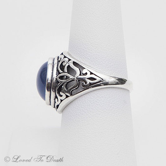 Victorian Inspired Sterling Filigree Blue Feline Taxidermy Eye Ring
