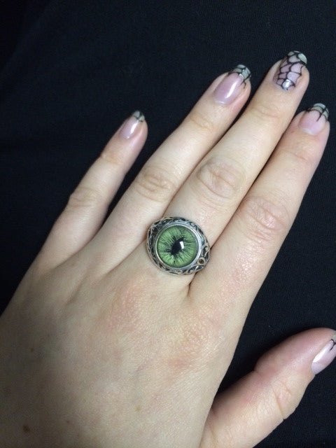 Victorian Inspired Sterling Filigree Green Feline Taxidermy Eye Ring