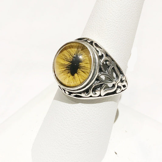 Victorian Inspired Sterling Filigree Yellow Feline Taxidermy Eye Ring