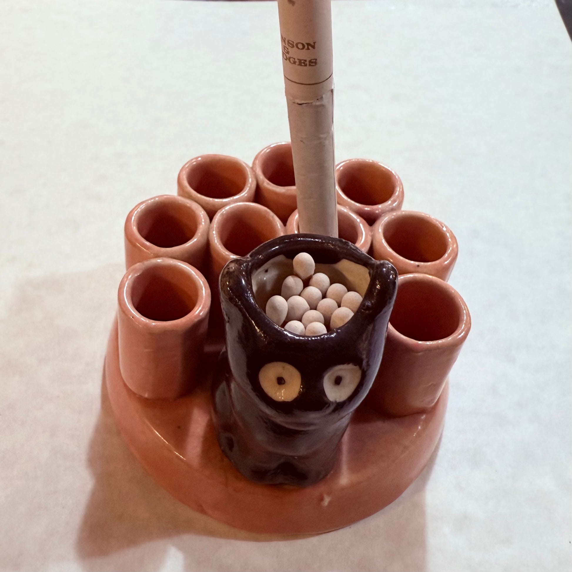 Antique Black cat ciggie & matches holder. In great condition marked JAPAN on bottom.