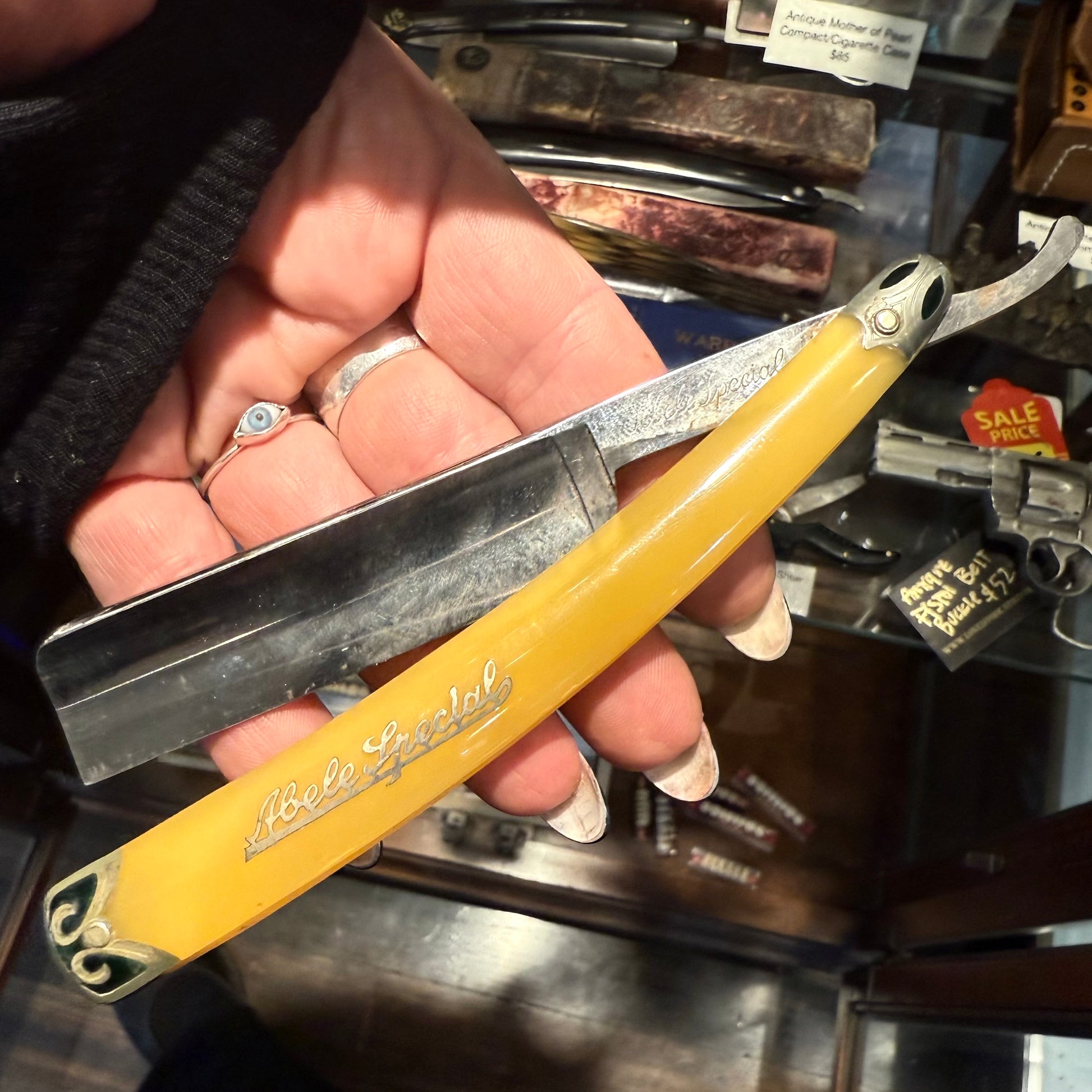 Antique Abele Special celluloid straight razor, black and silver detailing on ends. In beautiful condition see photos. Comes with box, not original box.