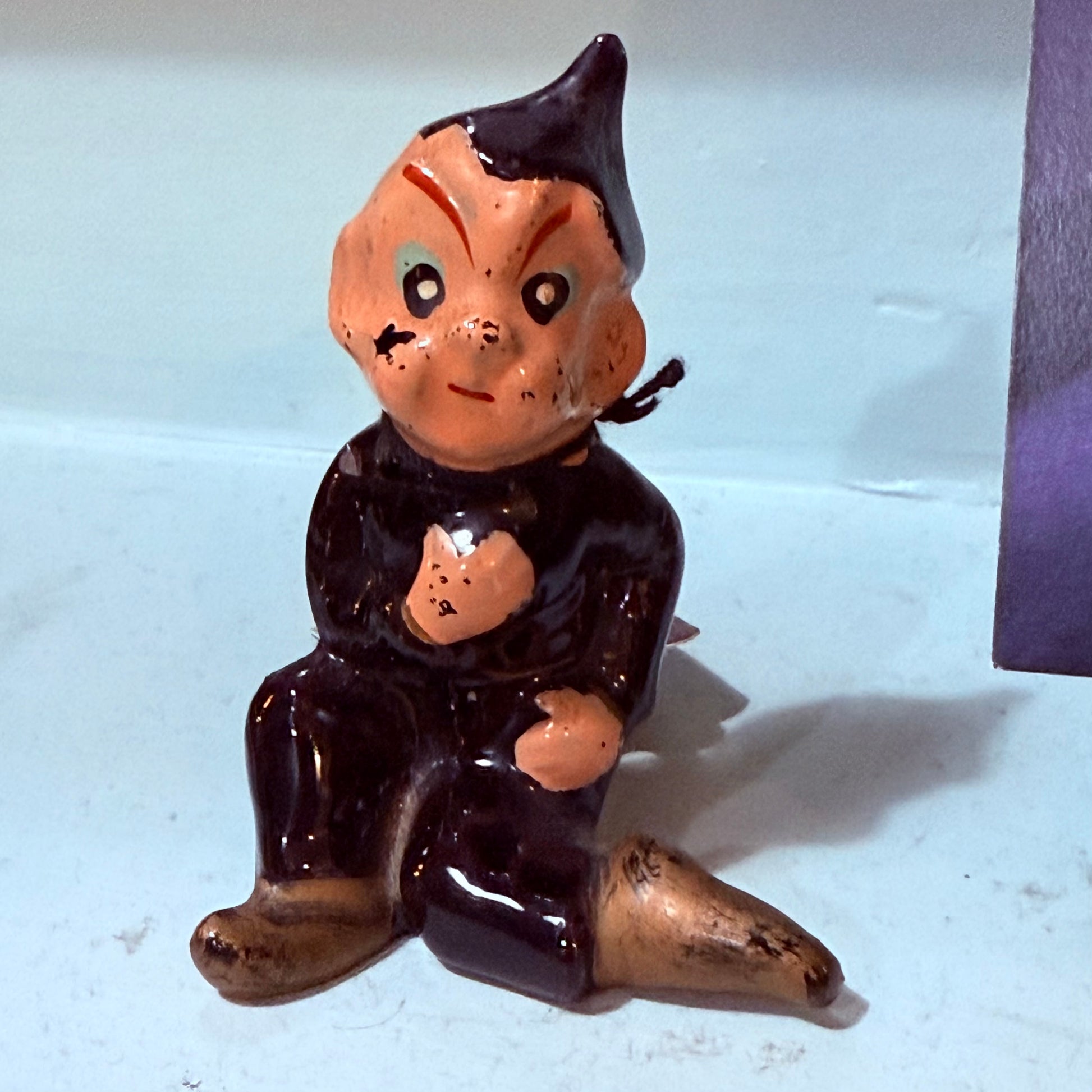 Antique Elf figurine wearing black clothing with gold elf boots. Measures approx 3”. Some paint loss no chips.