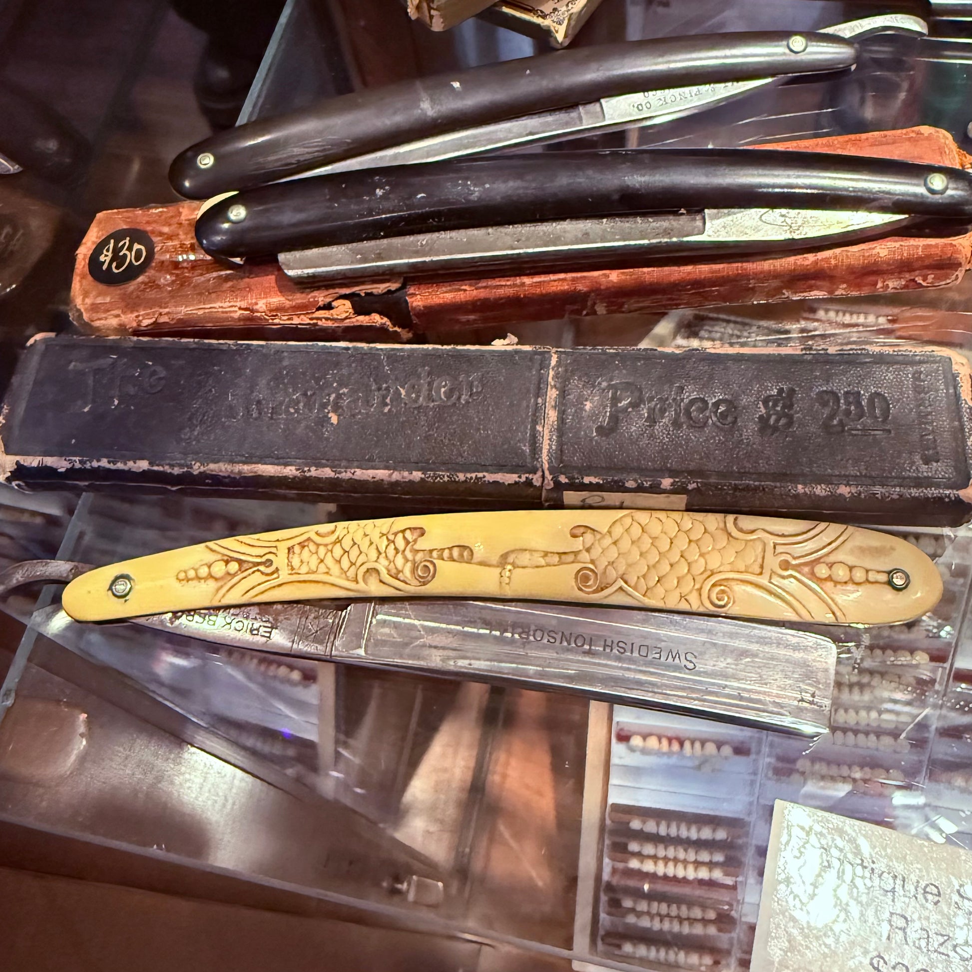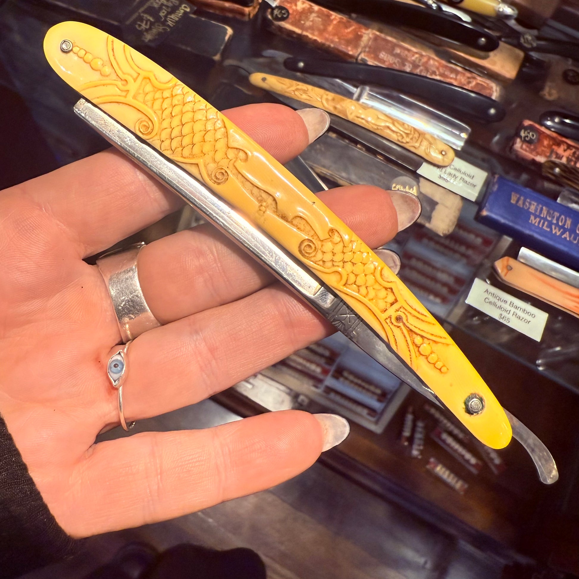 Antique floral filigree scales motif celluloid straight razor, in beautiful condition see photos. Comes with box, not original.