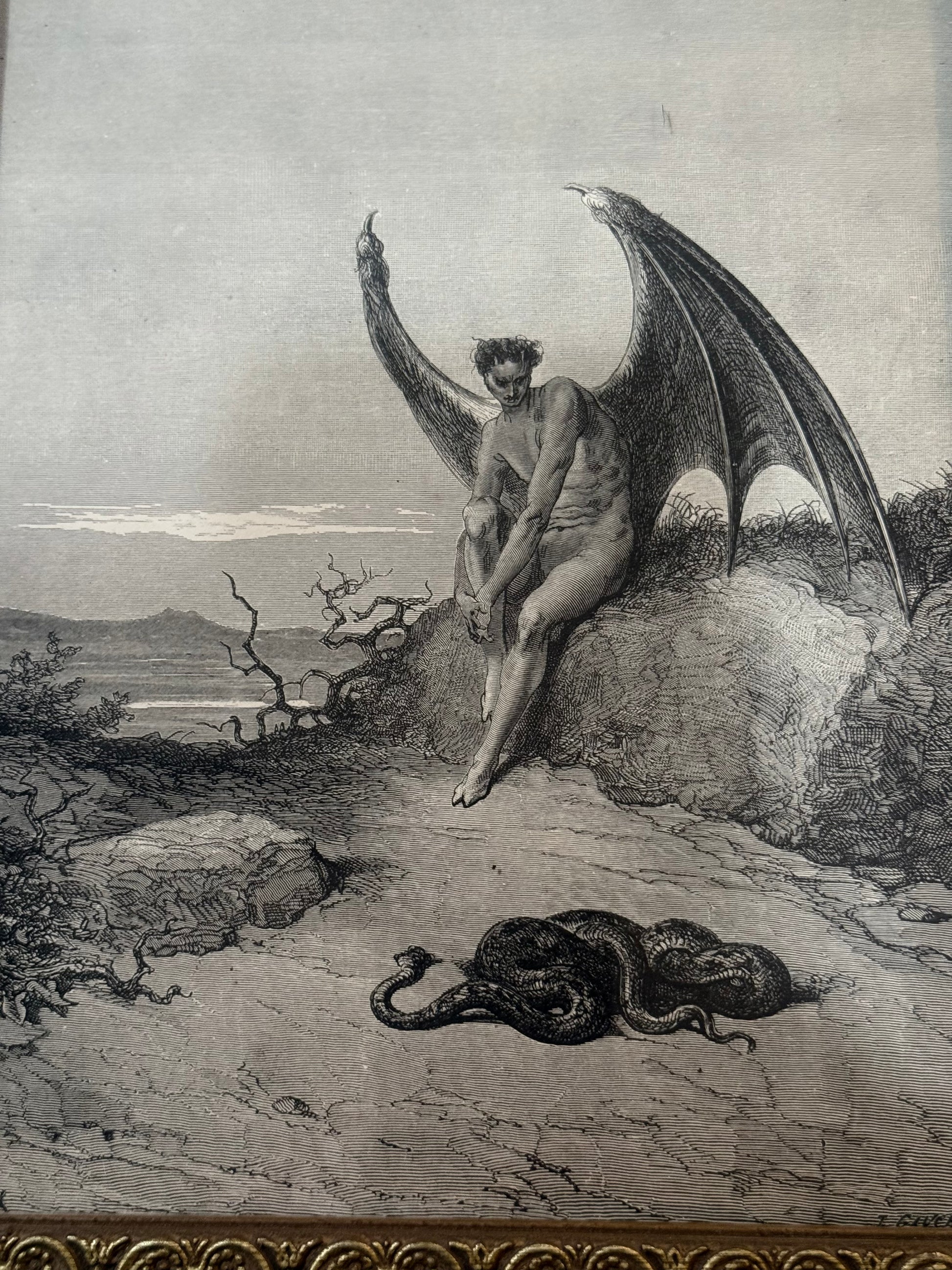 Antique Gustave Dore book plate of Lucifer and the Serpent, framed in vintage 8”x 10” frame.