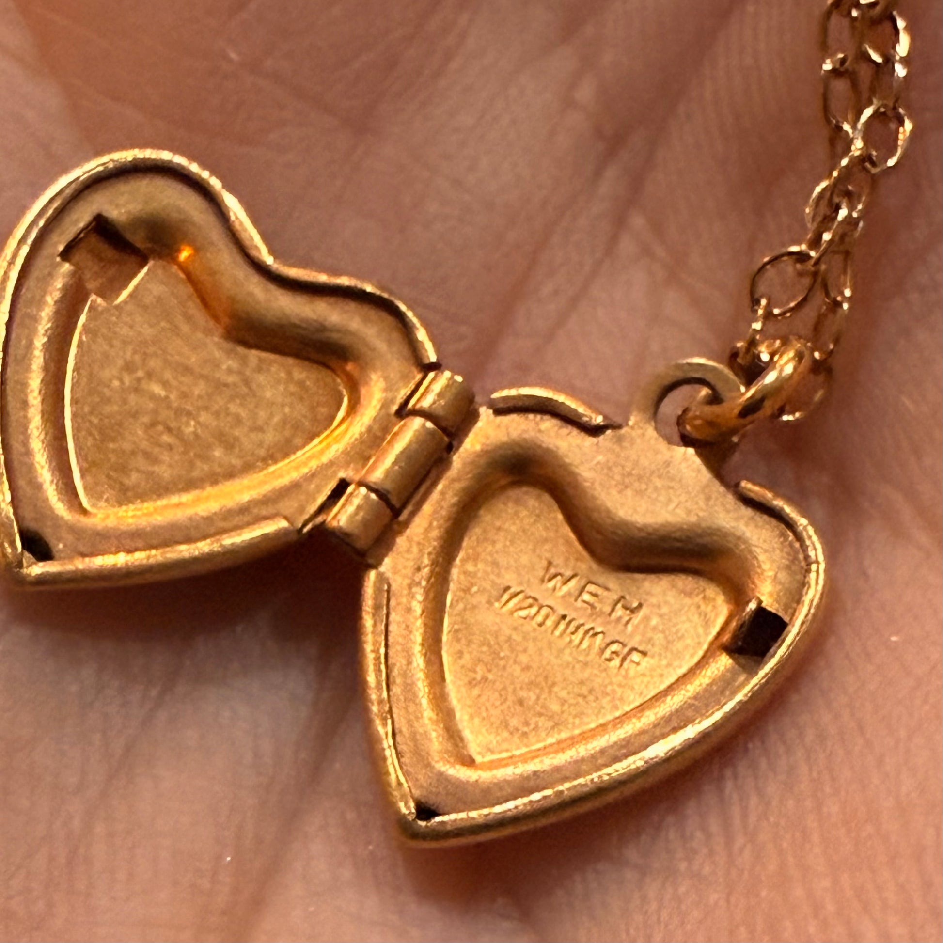 Beautiful antique mini gold filled heart locket. Made by and marked Walter E Howard 1/20 gf from the 1930’s. Chain is 16”.