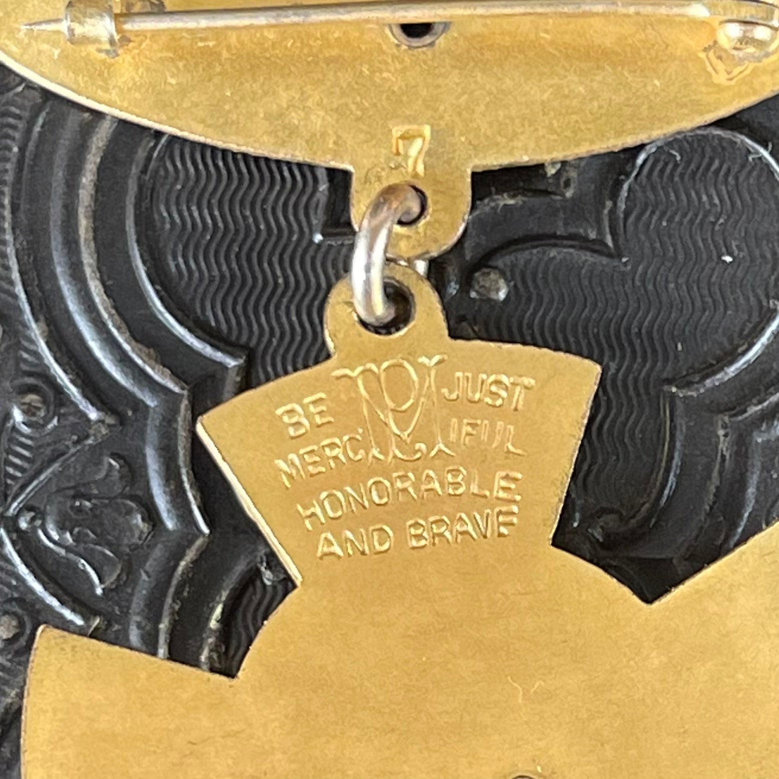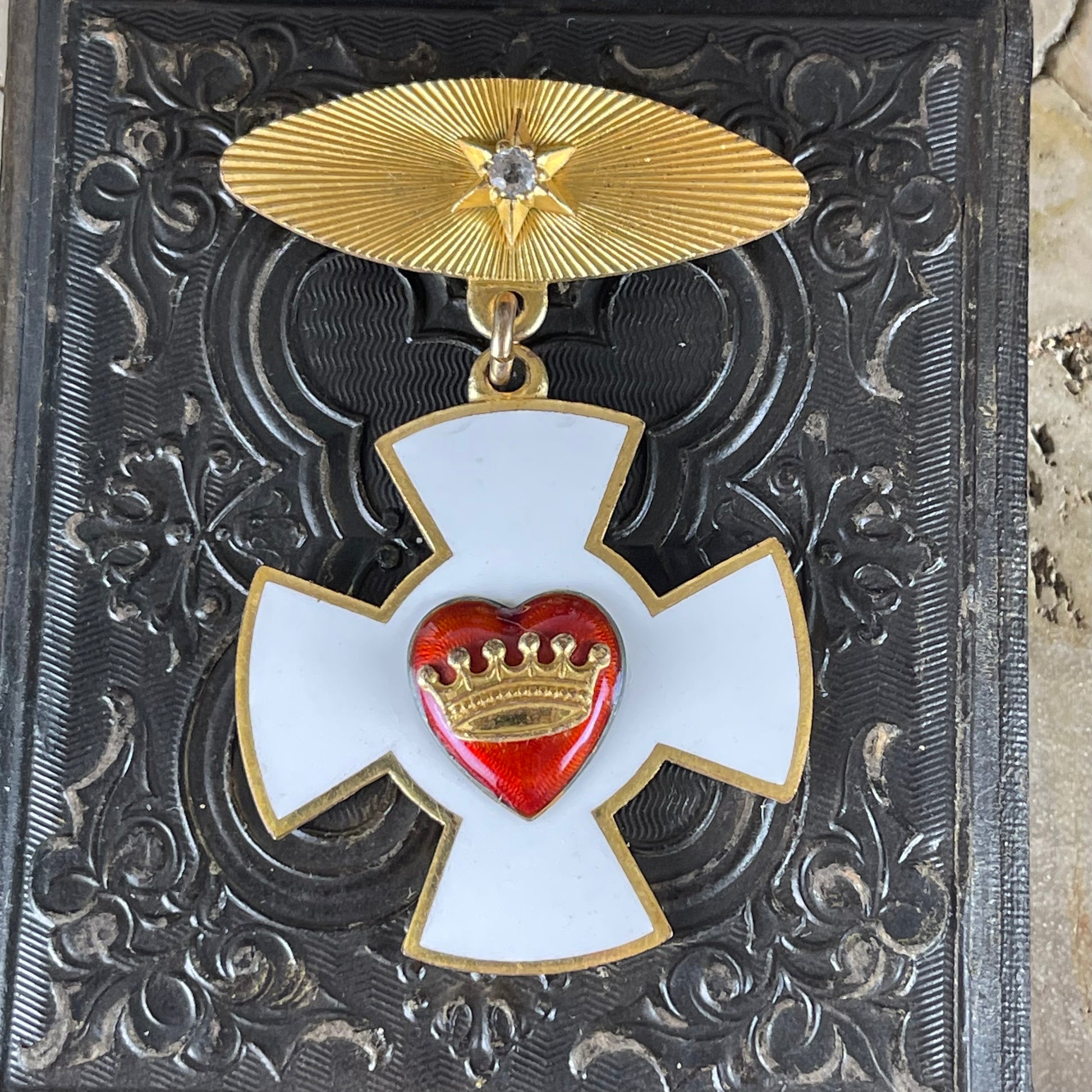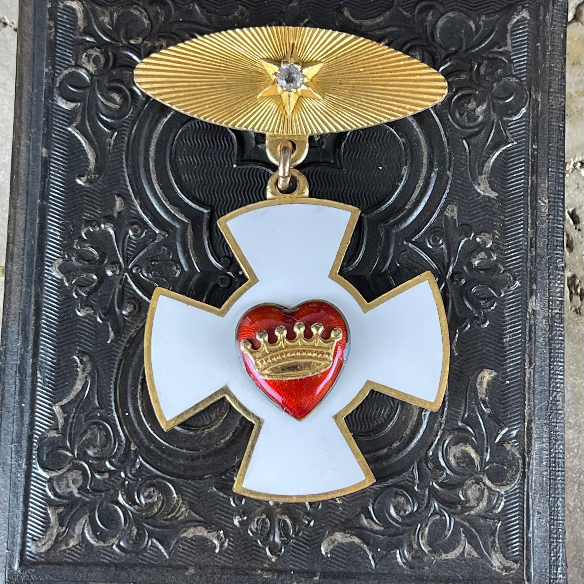 Antique Oddfellows Daughters of Rebekah’s Chivalry medal. Beautiful imagery of a red heart and crown set on white enamel, reverse reads “Be just merciful honorable and brave”, rhinestone set in center of top piece. Measures approx 3”.