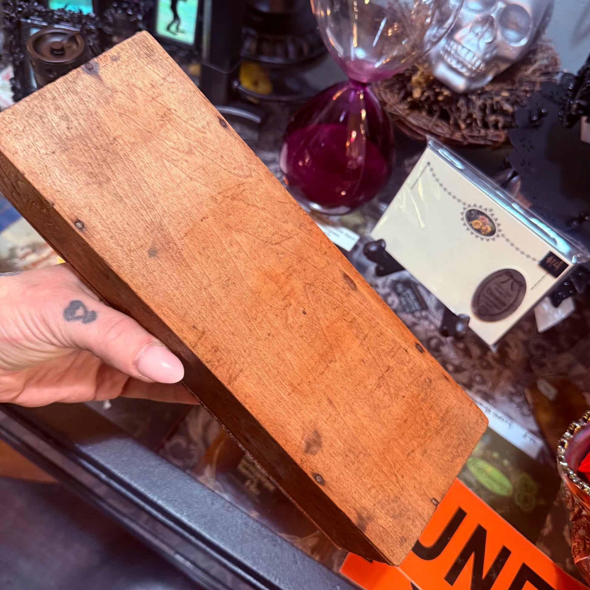 Antique wooden Pyrography wood burned hinged box with cherries on the lid. Measures approximately 10” x 3” x 2”.