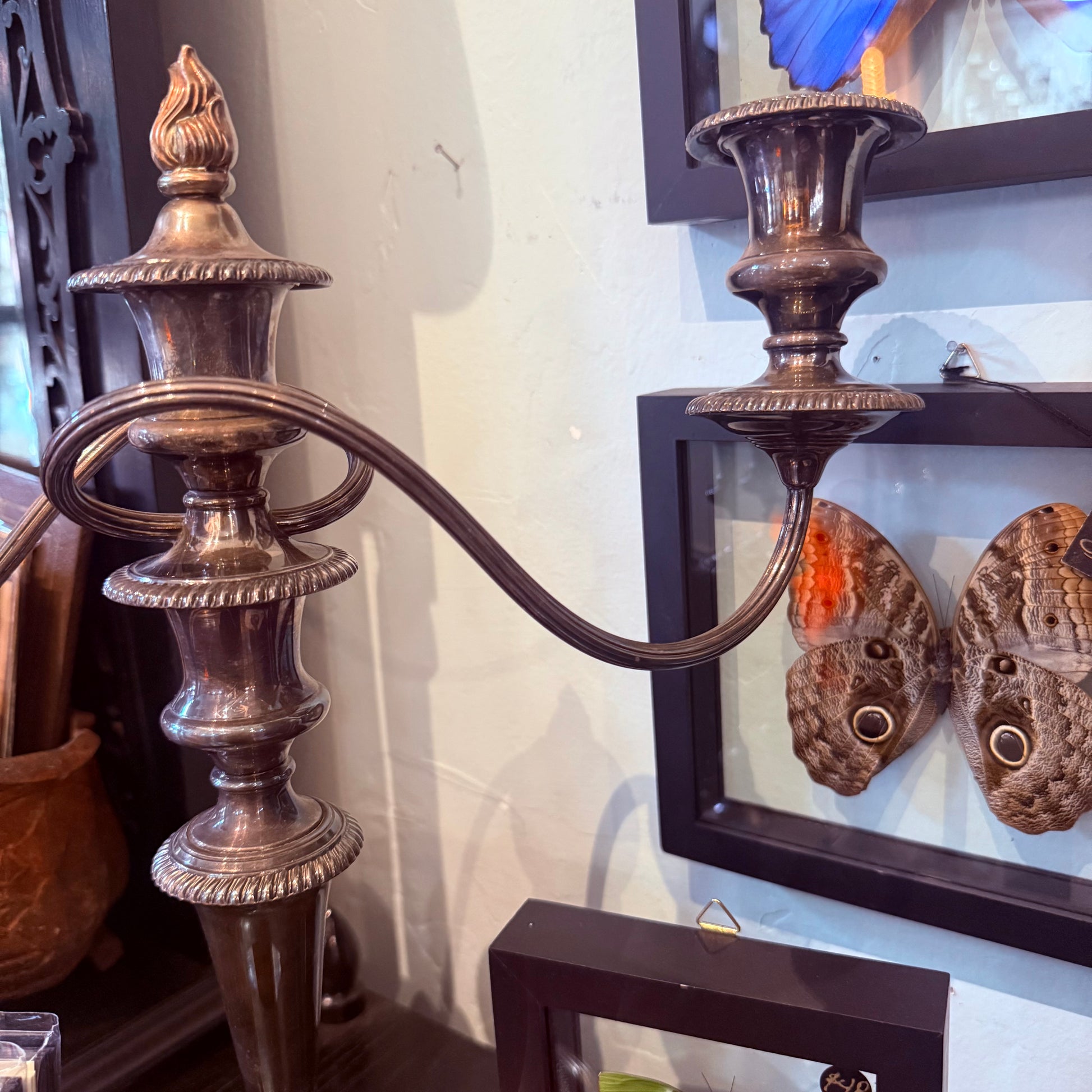 Antique Silver Plate Two Arm Triple Candelabra With Torch Finial
