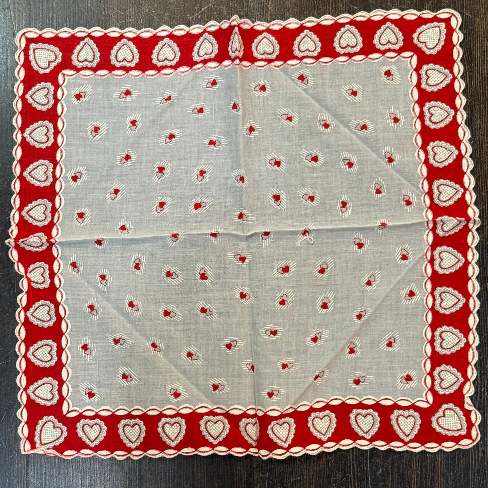 Beautiful antique Valentine red & white hearts & scalloped edges handkerchief measures 14” x 14”.