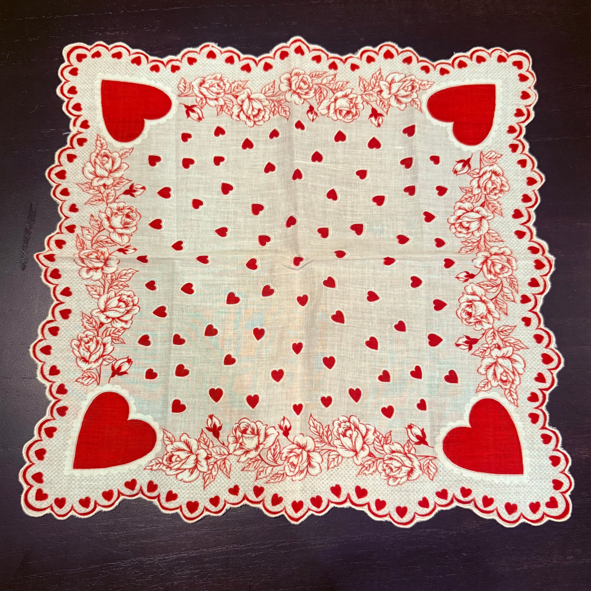 Beautiful antique Valentine red & white hearts & scalloped edges handkerchief measures 14” x 14”.