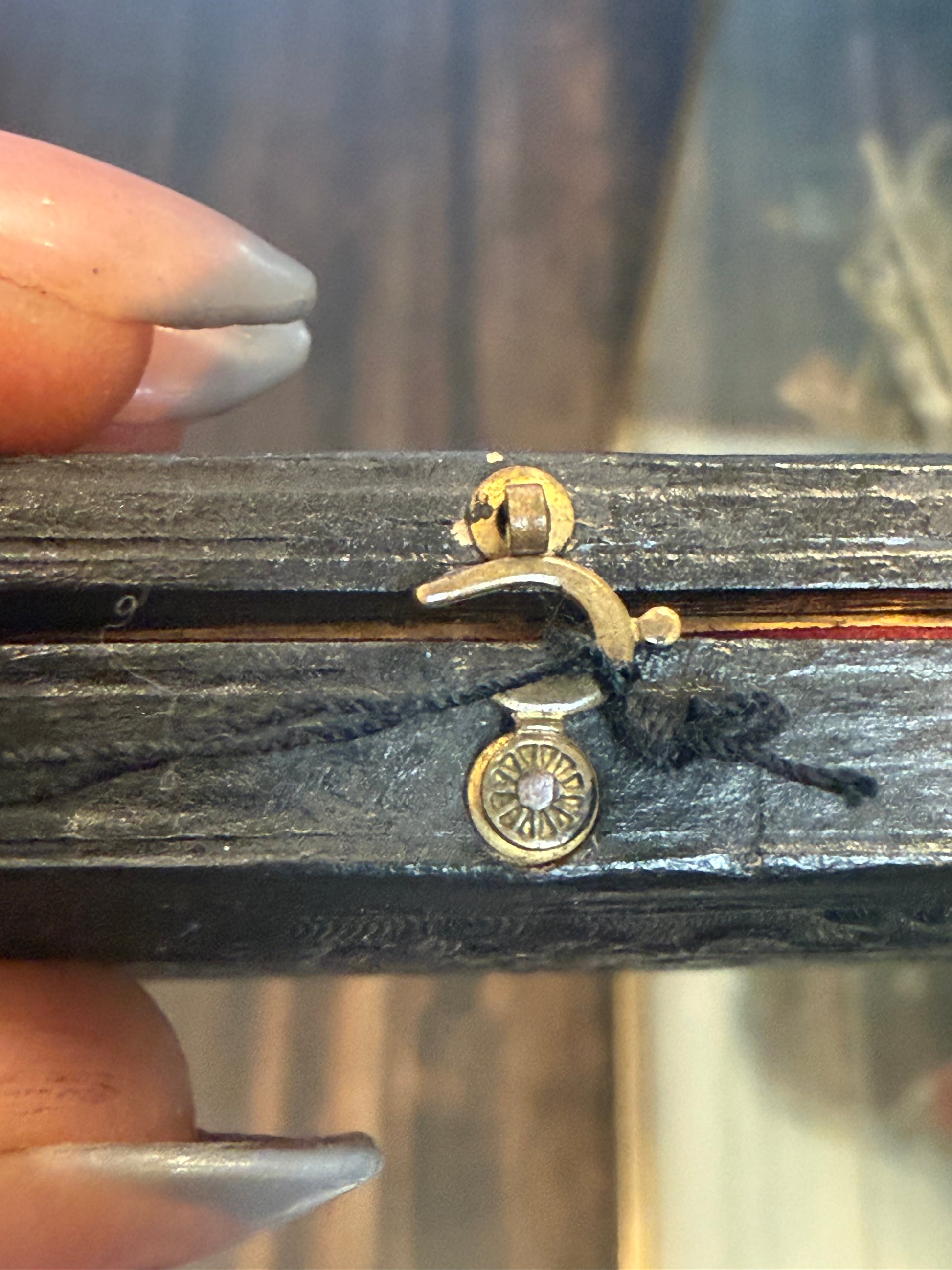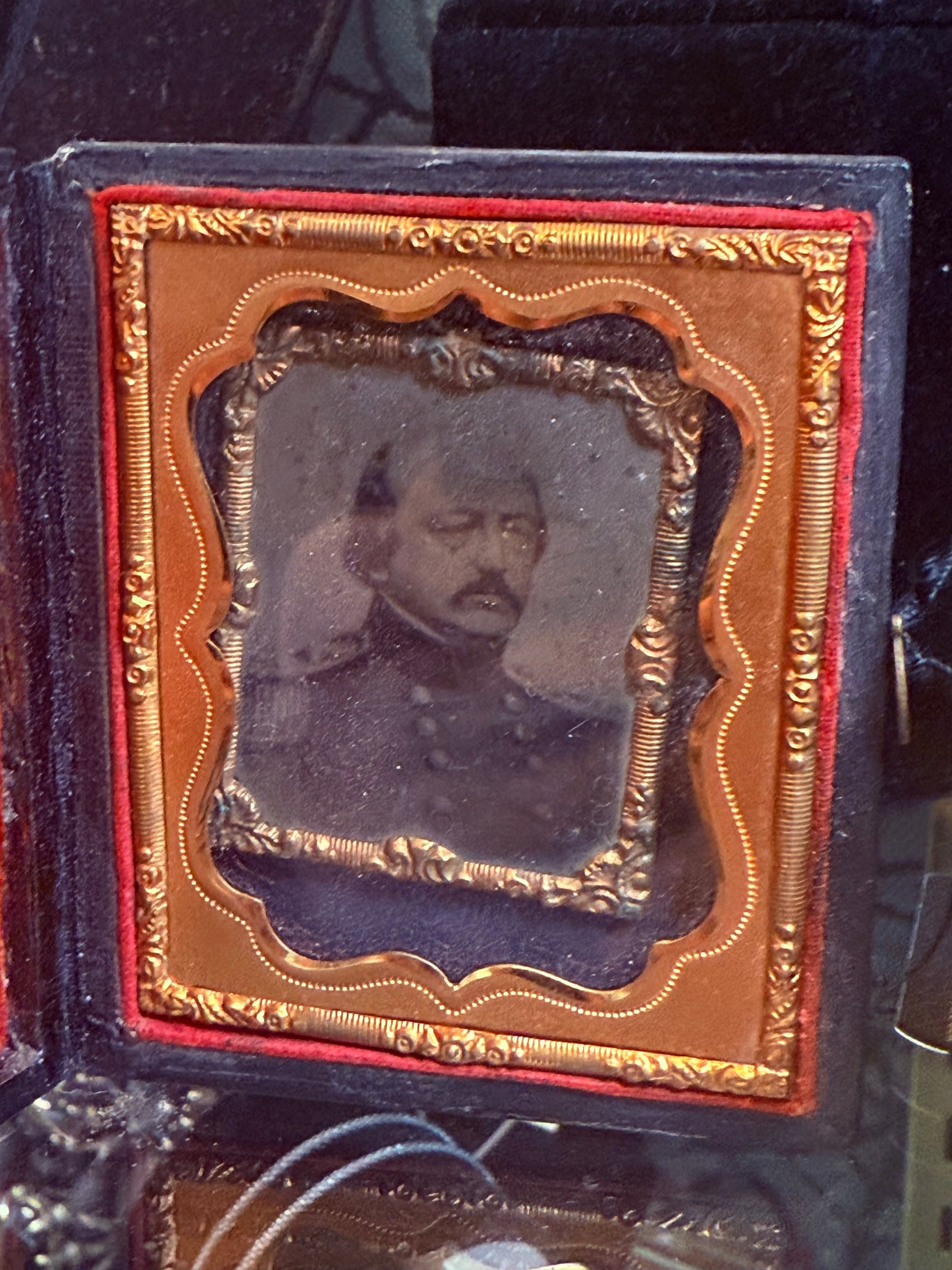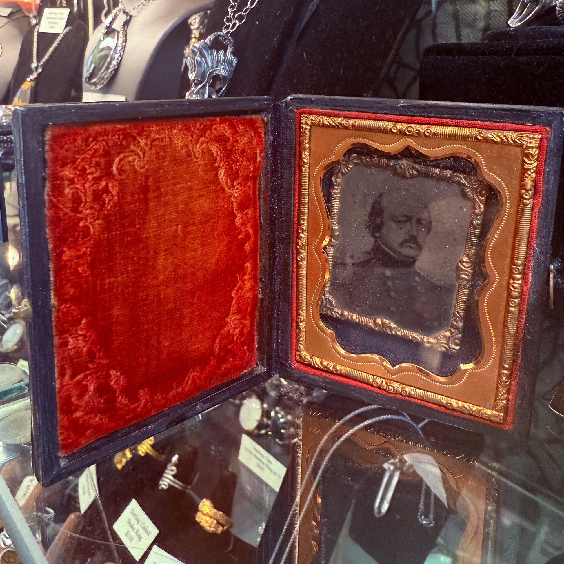 Victorian mini tintype in original copper filigree framing with copper loop at the top set in full case. Measures approx 2 1/4” x 2 1/2”, photo is clear with glass front. This is a rare item.