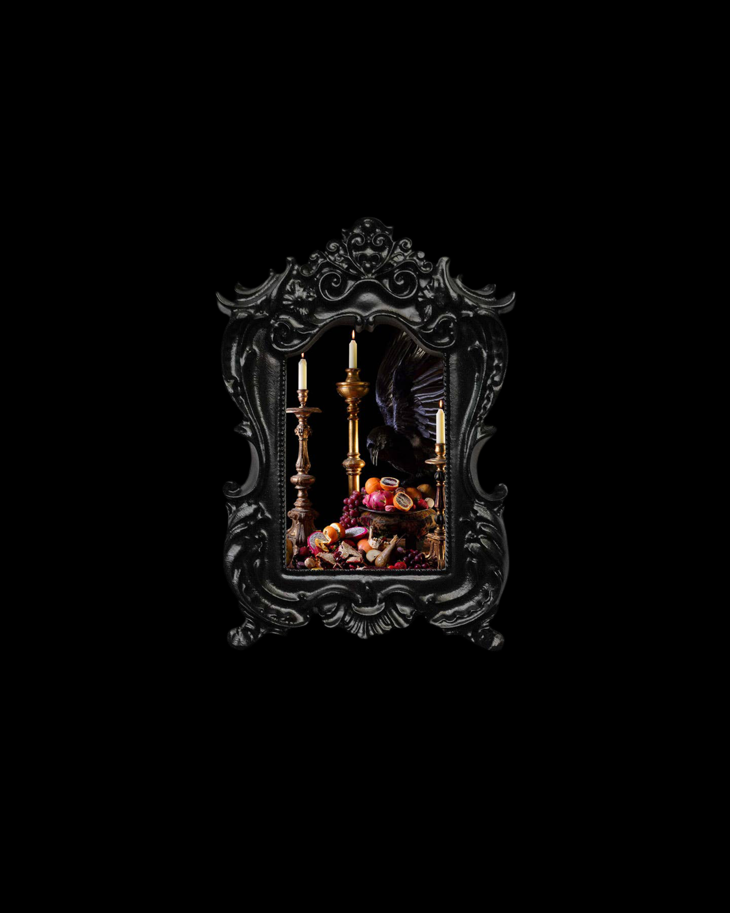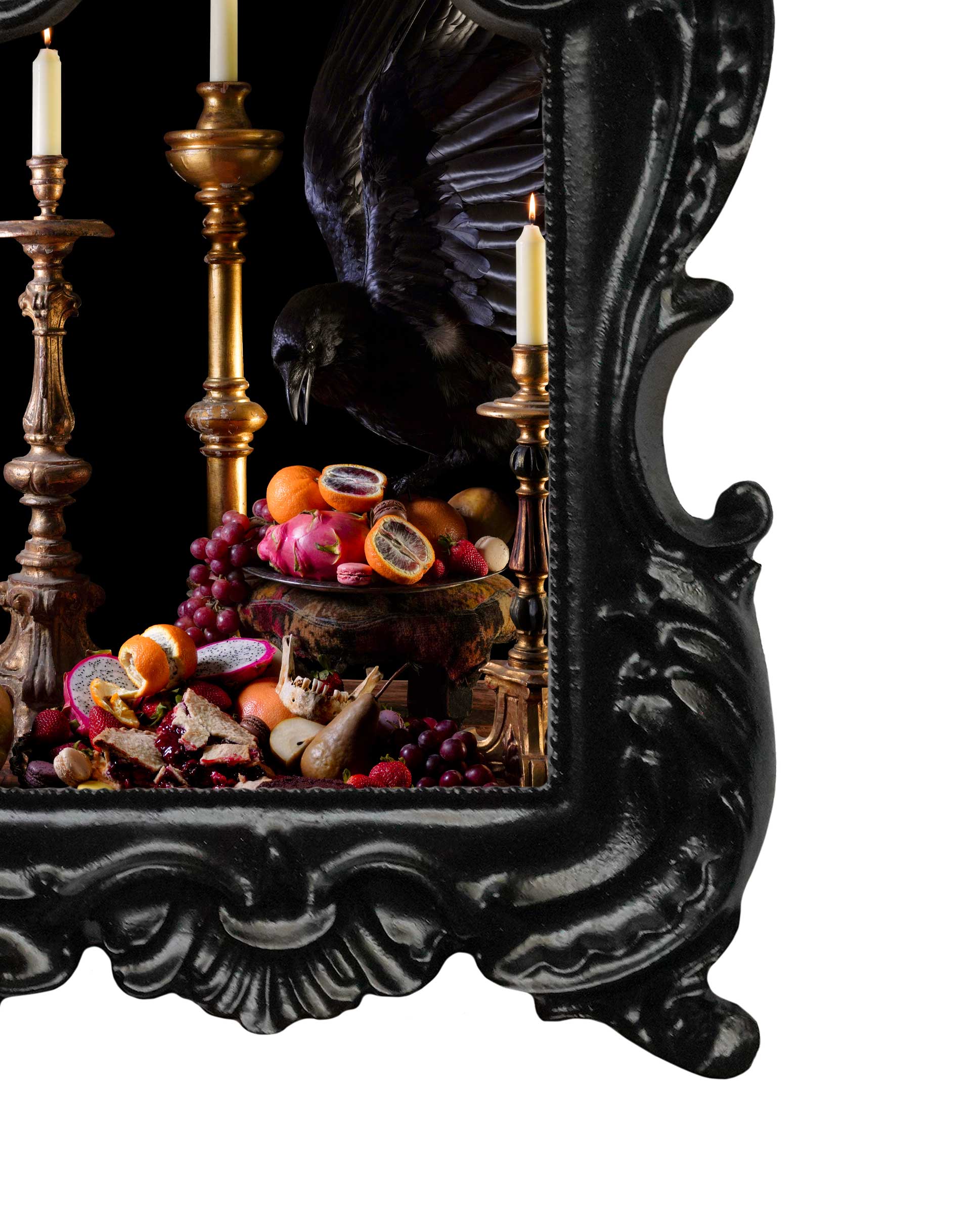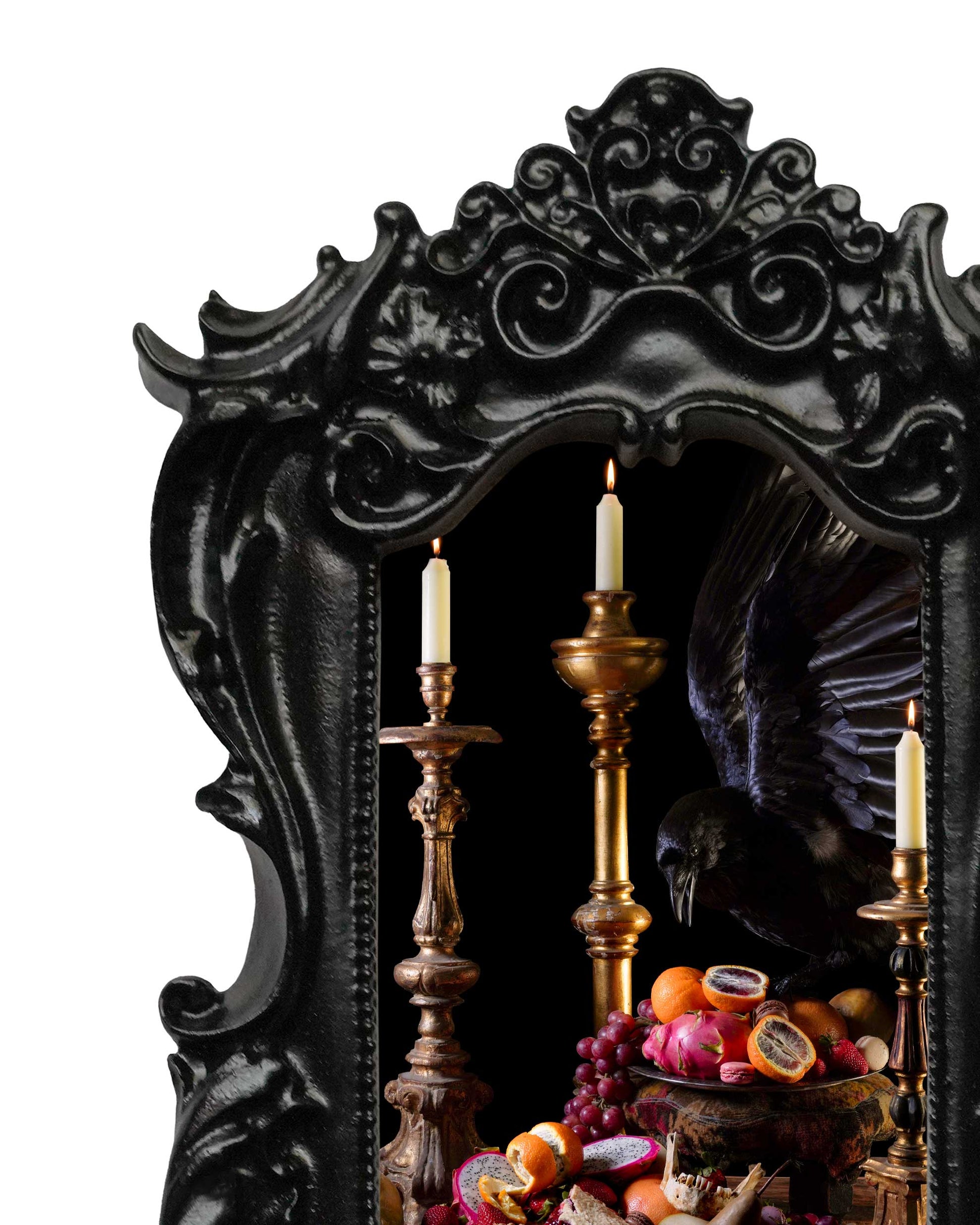 Inspired by the dramatic lighting and deep symbolism of 17th-century Dutch masters, this contemporary photograph titled 'Defier', was created as a profound memento mori (remember you must die). Add the perfect accent to your curio cabinet or shelves with this Mini Frame Print.