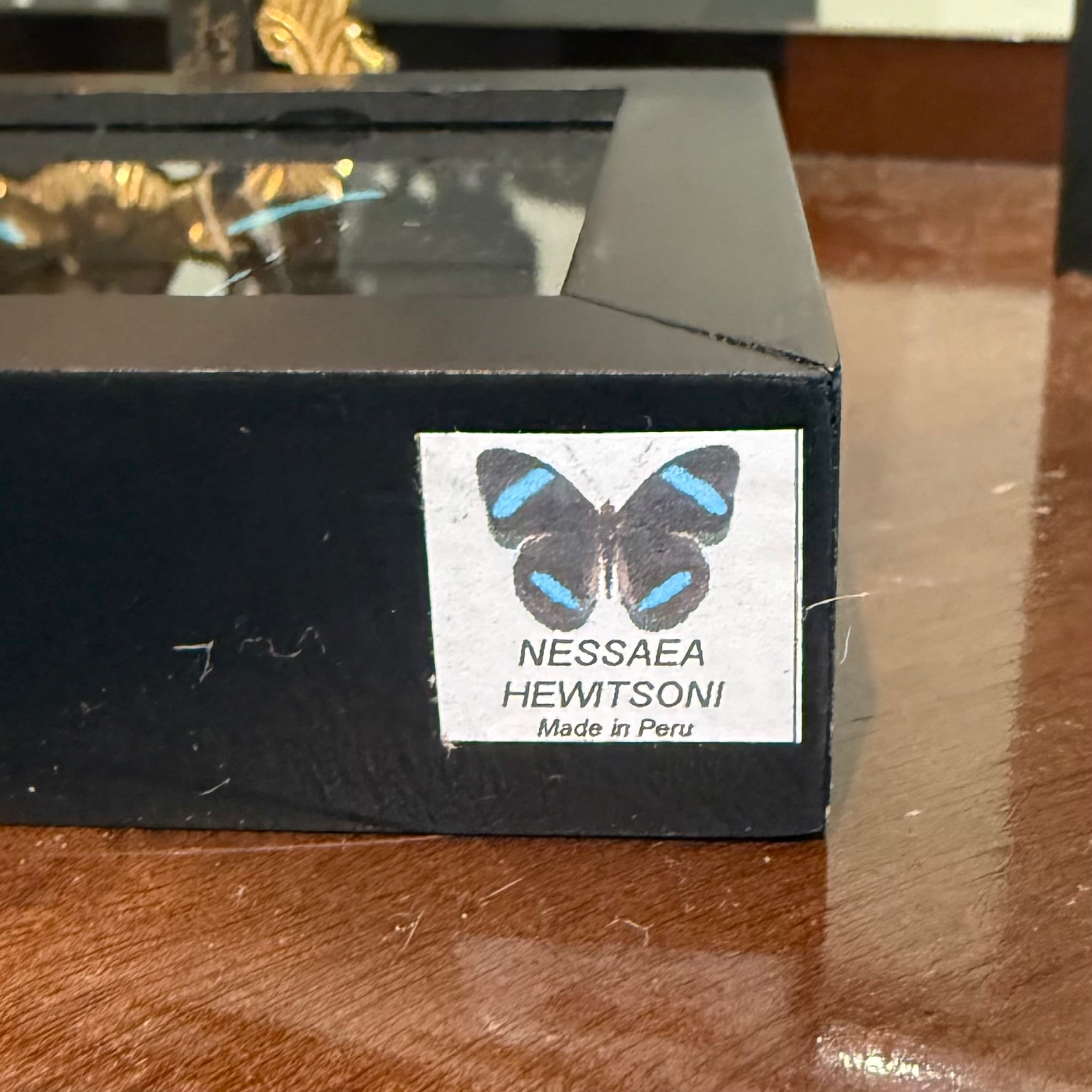 Nesaea Hewitsoni butterfly specimen mounted in a double glass black wood frame. Measures 4 3/4" tall x 4 3/4" wide.