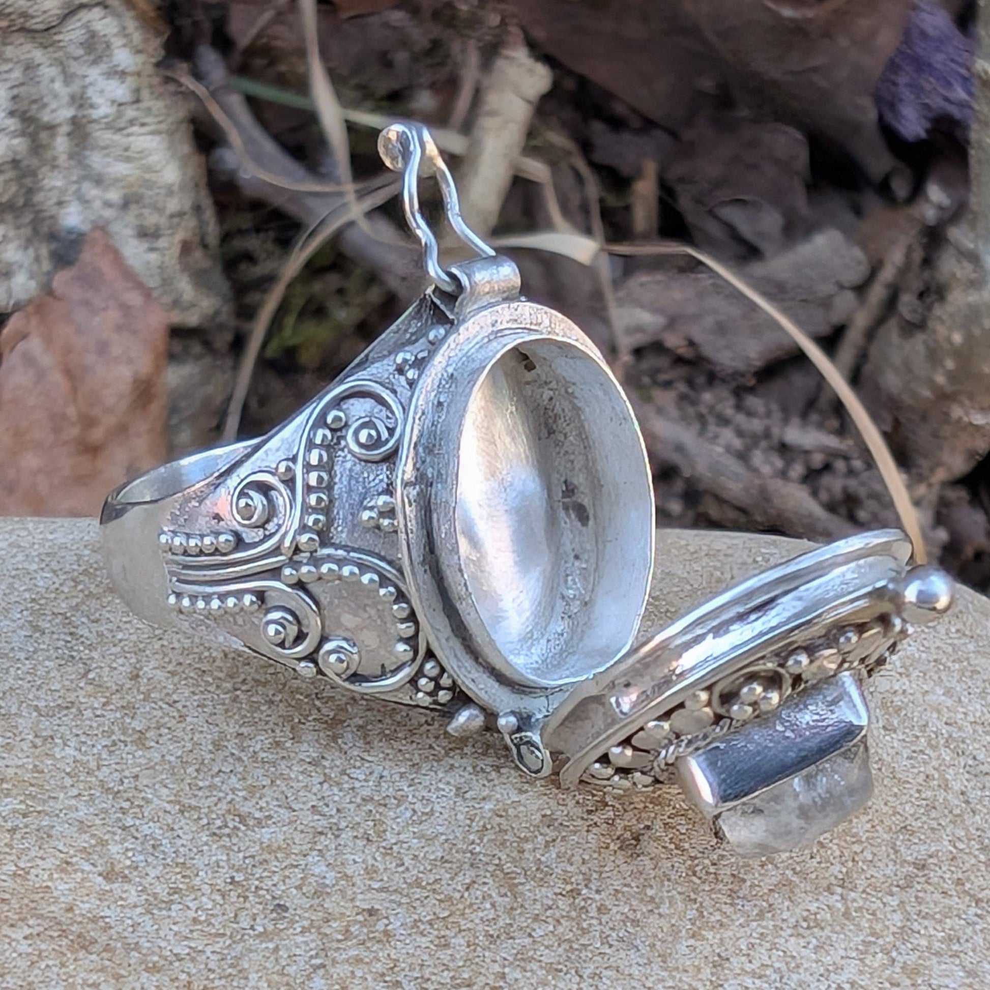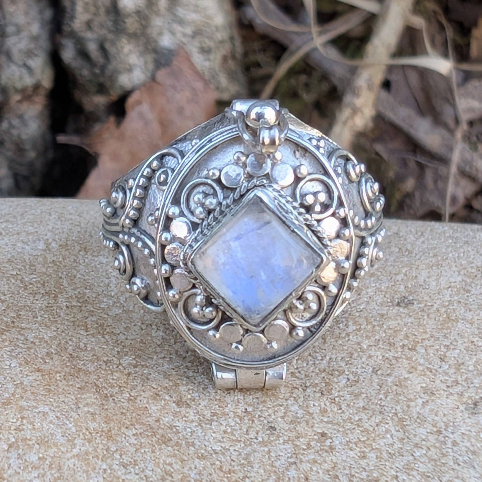 Marked 925 This poison ring is set with a genuine Moonstone gemstone and is crafted of solid sterling silver. It opens to reveal a secret compartment that could hold small pills, a prayer, or other small important keepsakes.