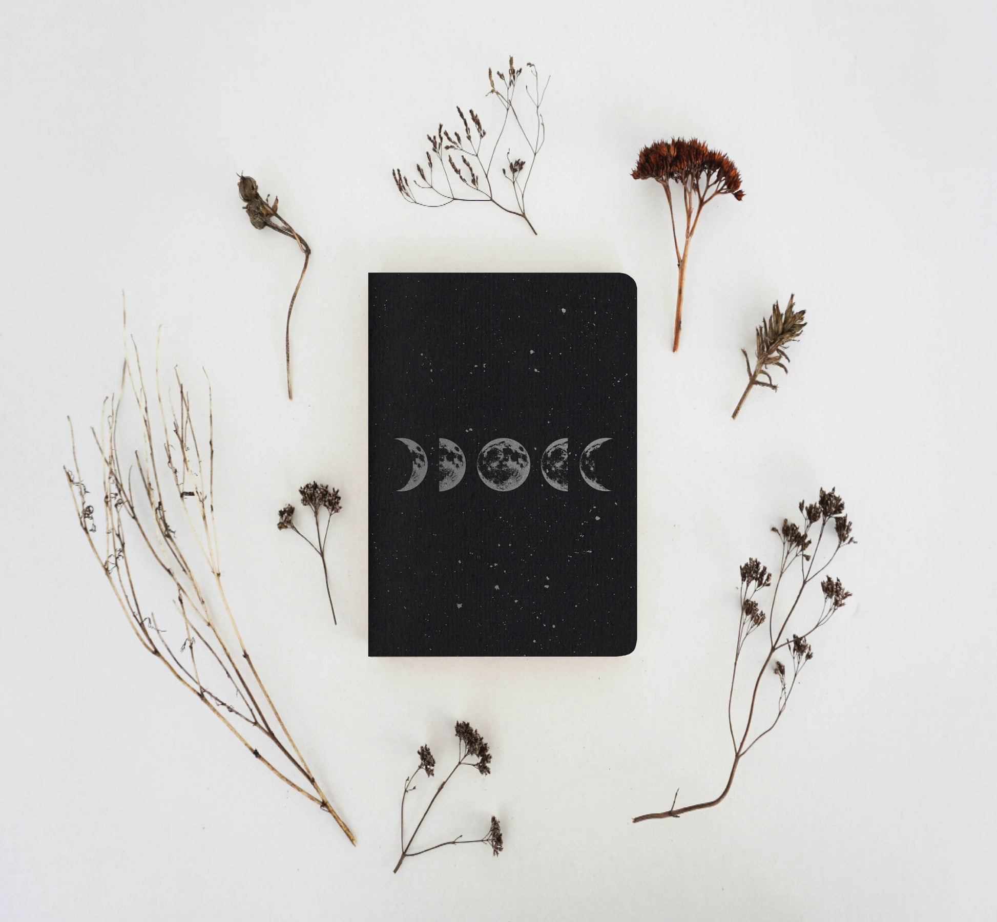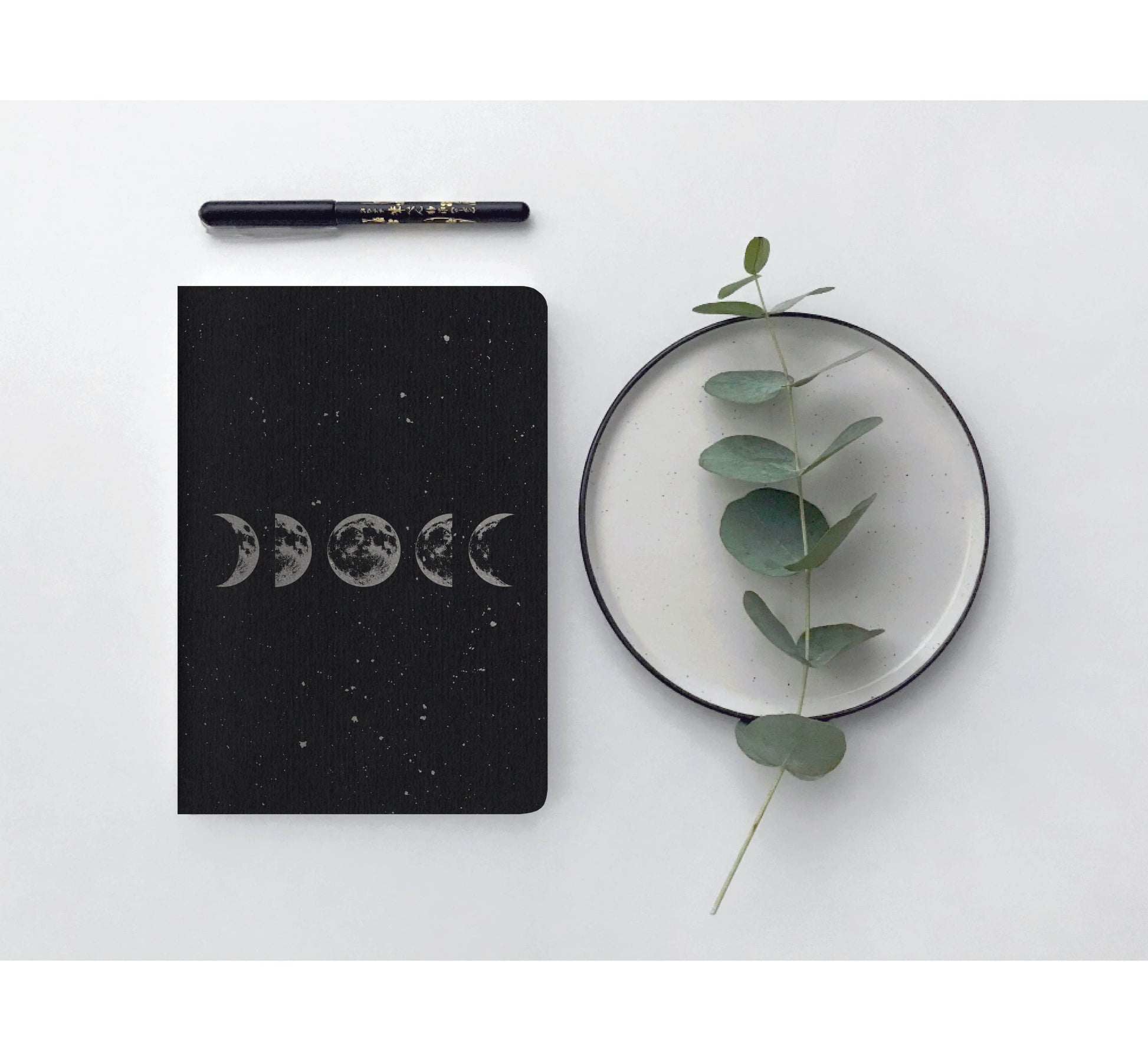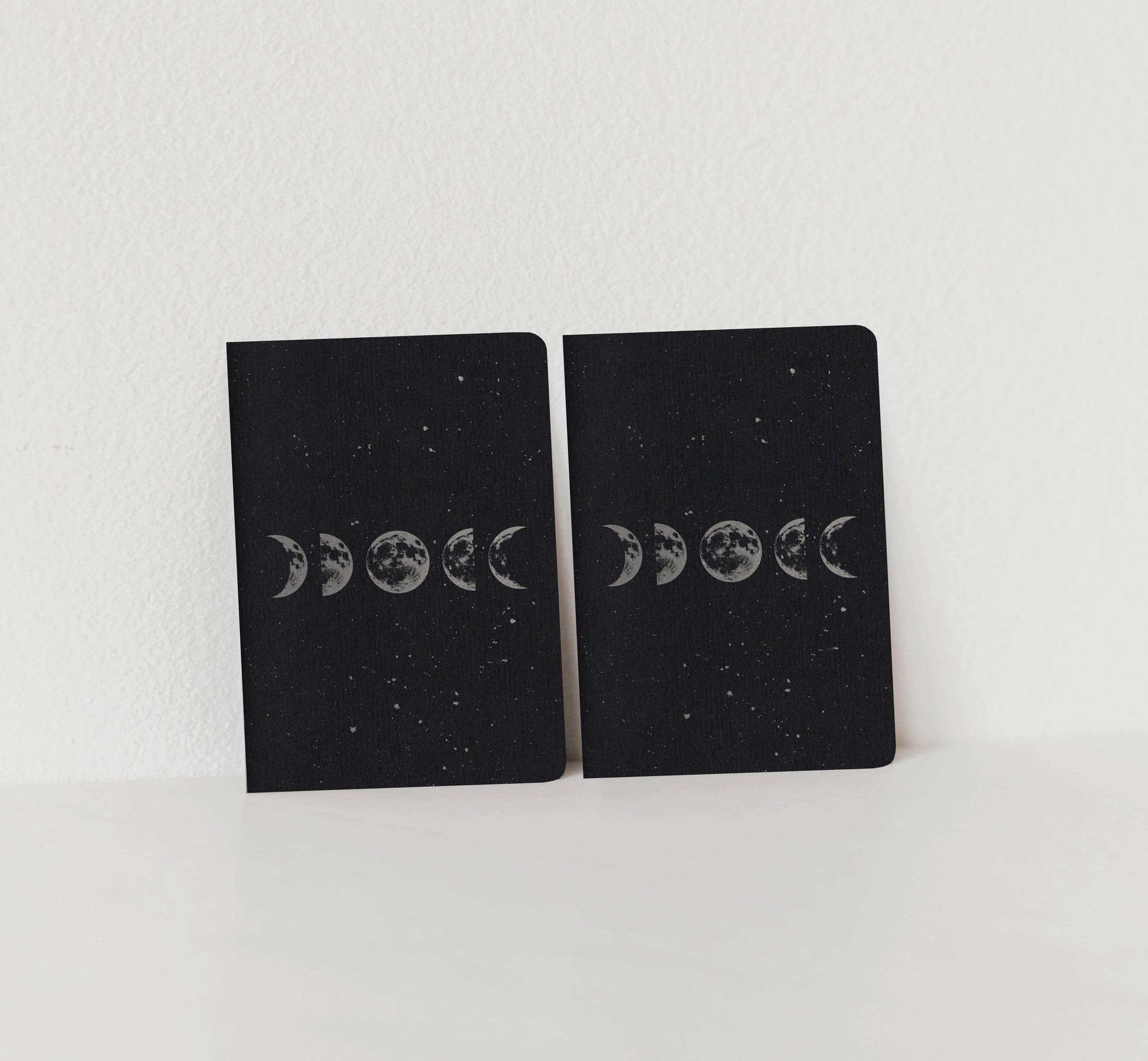 Original moon phase collage art pocket notebooks. Black with metallic silver ink.