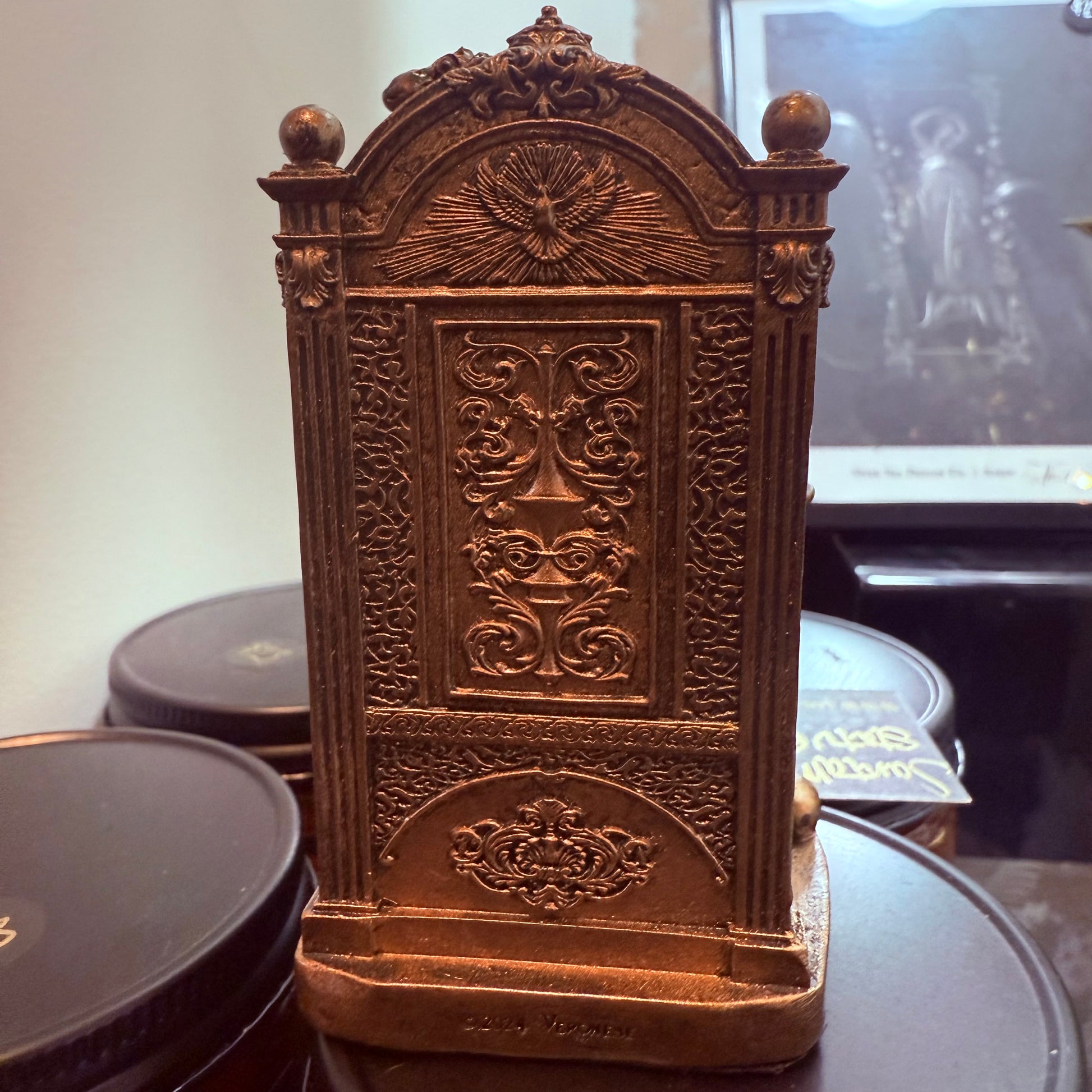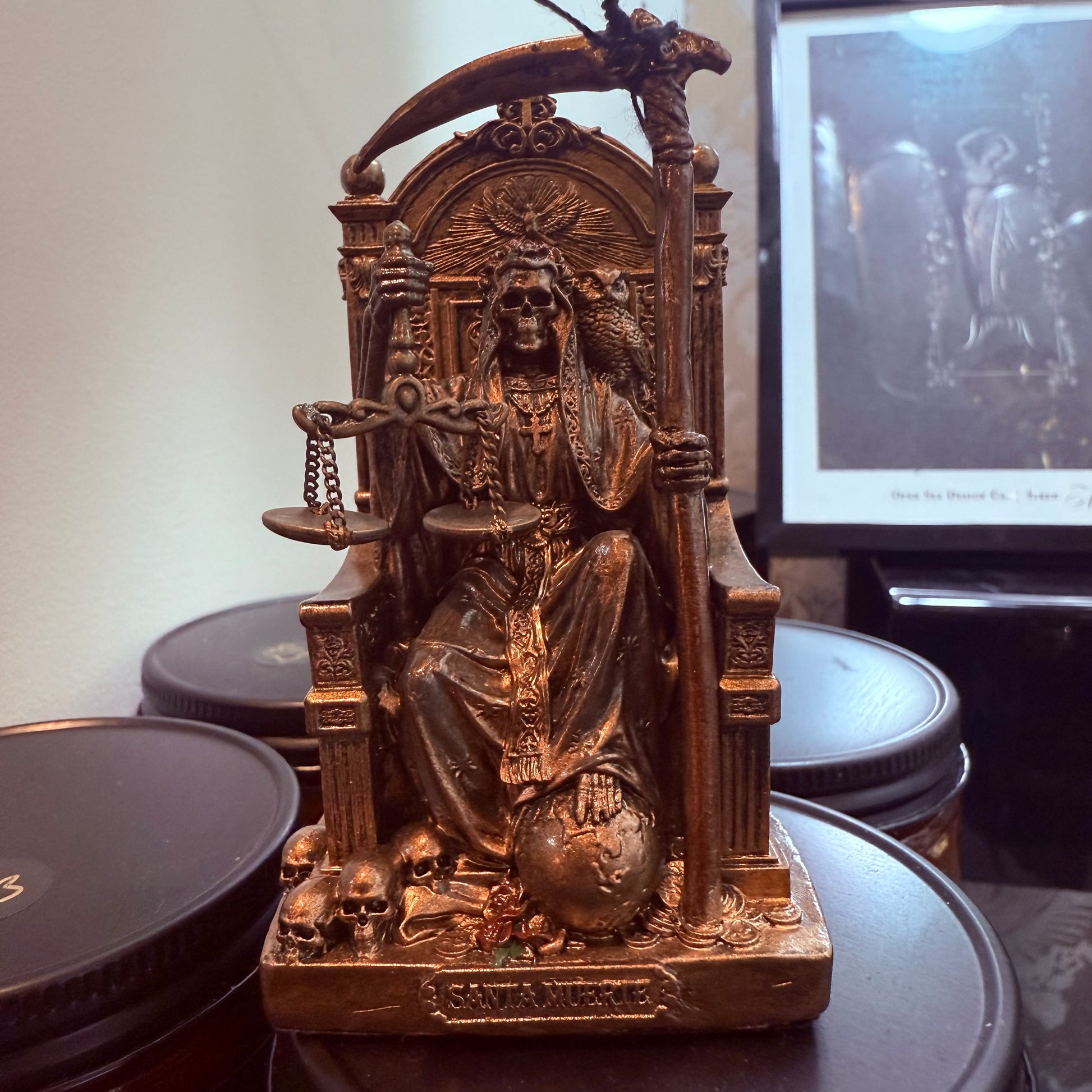 Samta Muerte mini altar statue in a polished bronze finish. measures approx 3” tall.