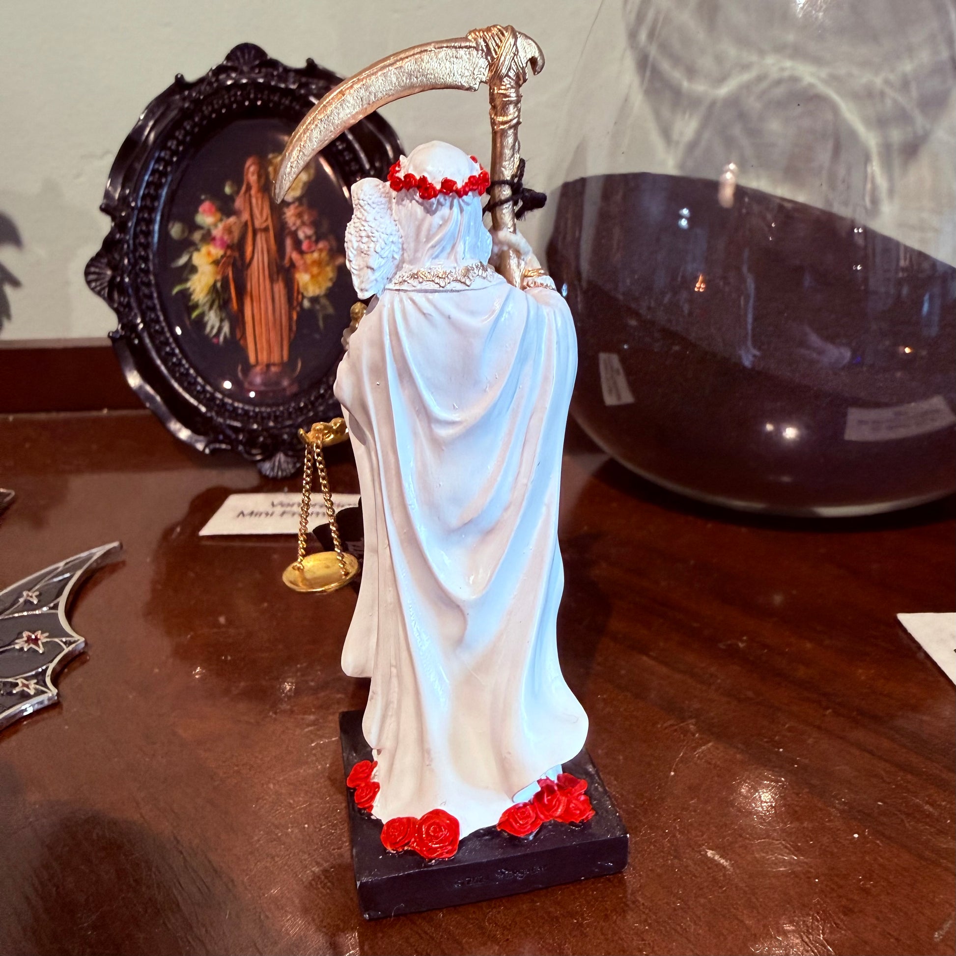 Santa Muerte mini altar statue in white robe. Measures approx 4” tall.