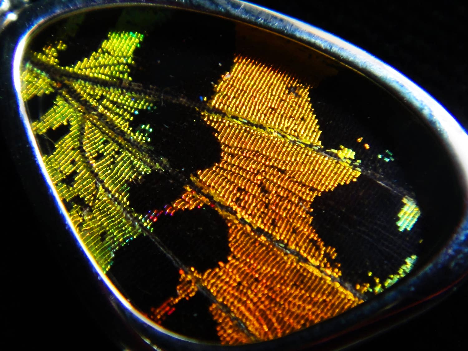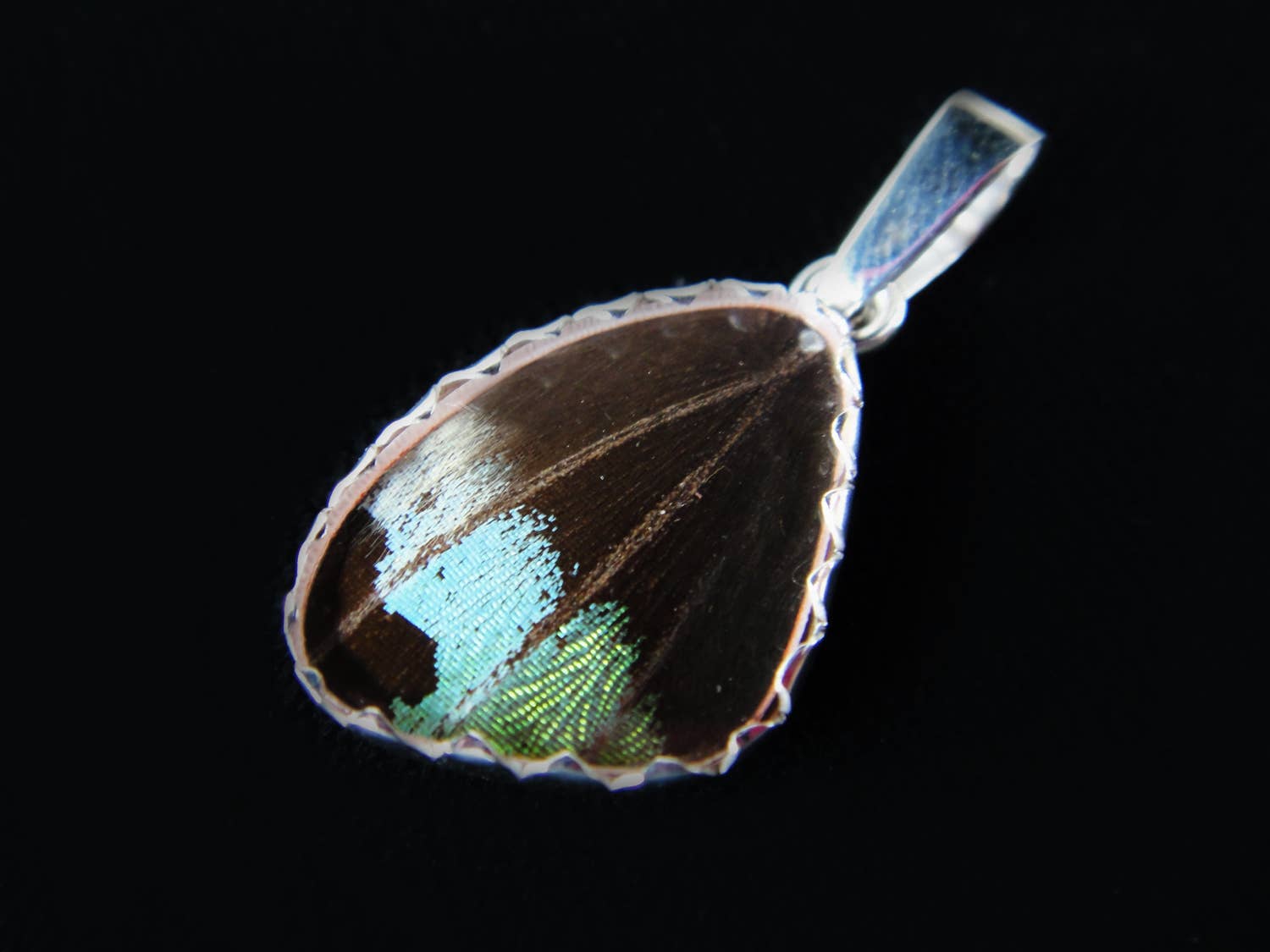 Tiny Rainbow Sunset (Urania rhipheus) sterling silver Pendant. This pendant is made from butterfly wings, the lower wings from the Rainbow Sunset Urania (moth); each piece is unique and some natural color variations occur. These pieces are durable and the colors will remain vibrant so long as you avoid exposure to moisture, including lotions and perfumes. Size: 20 x 15mm wing (approx ¾ inch plus bail) Material: natural butterfly wing set in sterling silver hangs from a sterling silver 18” chain.