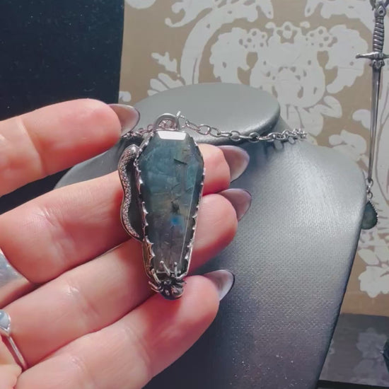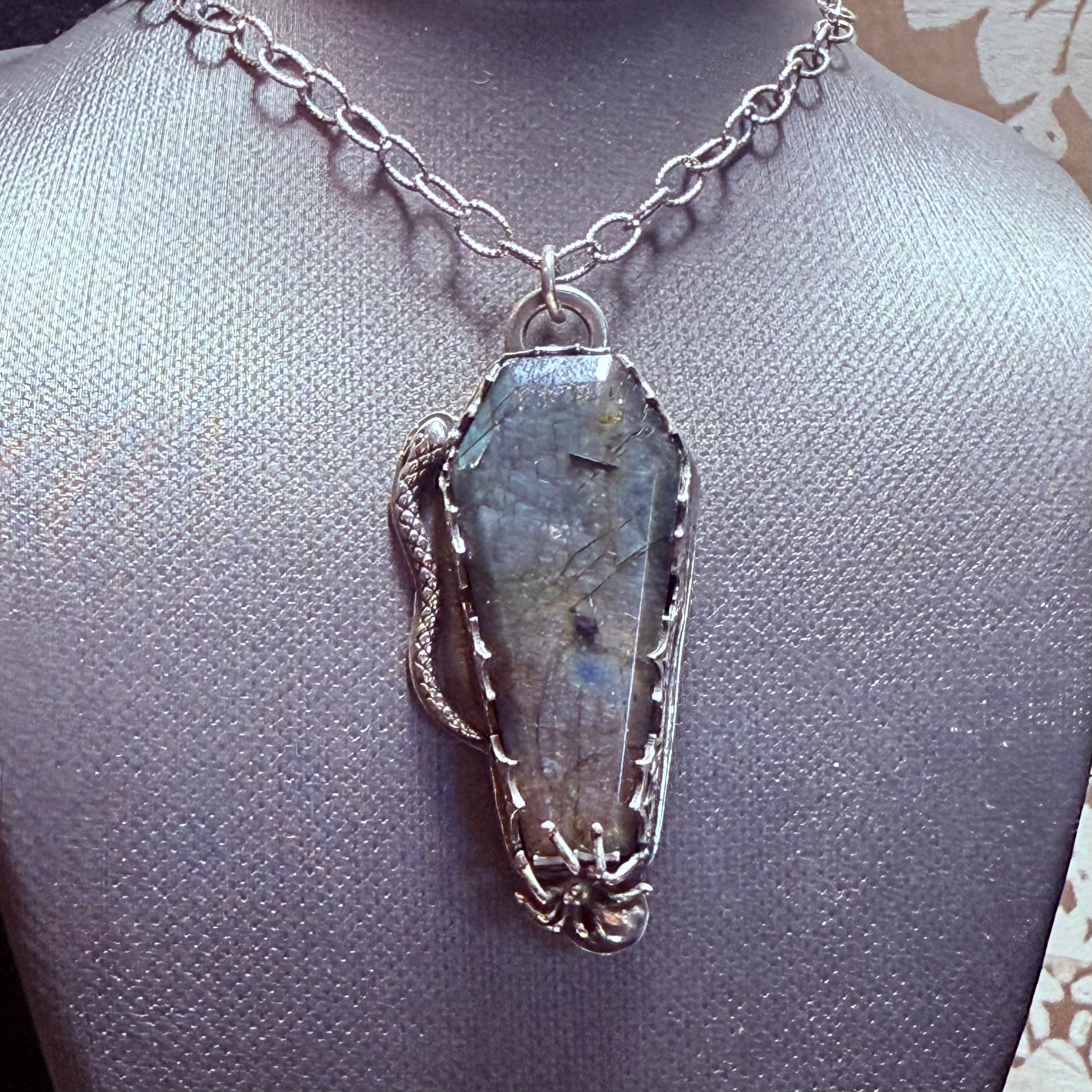 Sterling Silver Serpent and Spider Labradorite Coffin Necklace Gothic Victorian Handmade