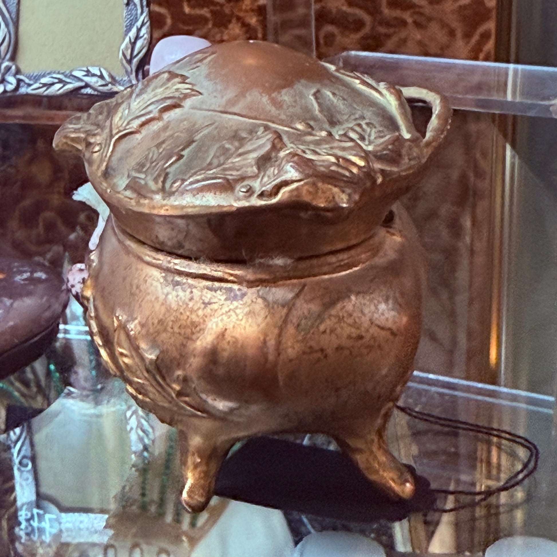Antique Victorian floral design casket jewelry box with original lining. Measures approx 3 1/2” wide and 3” tall.