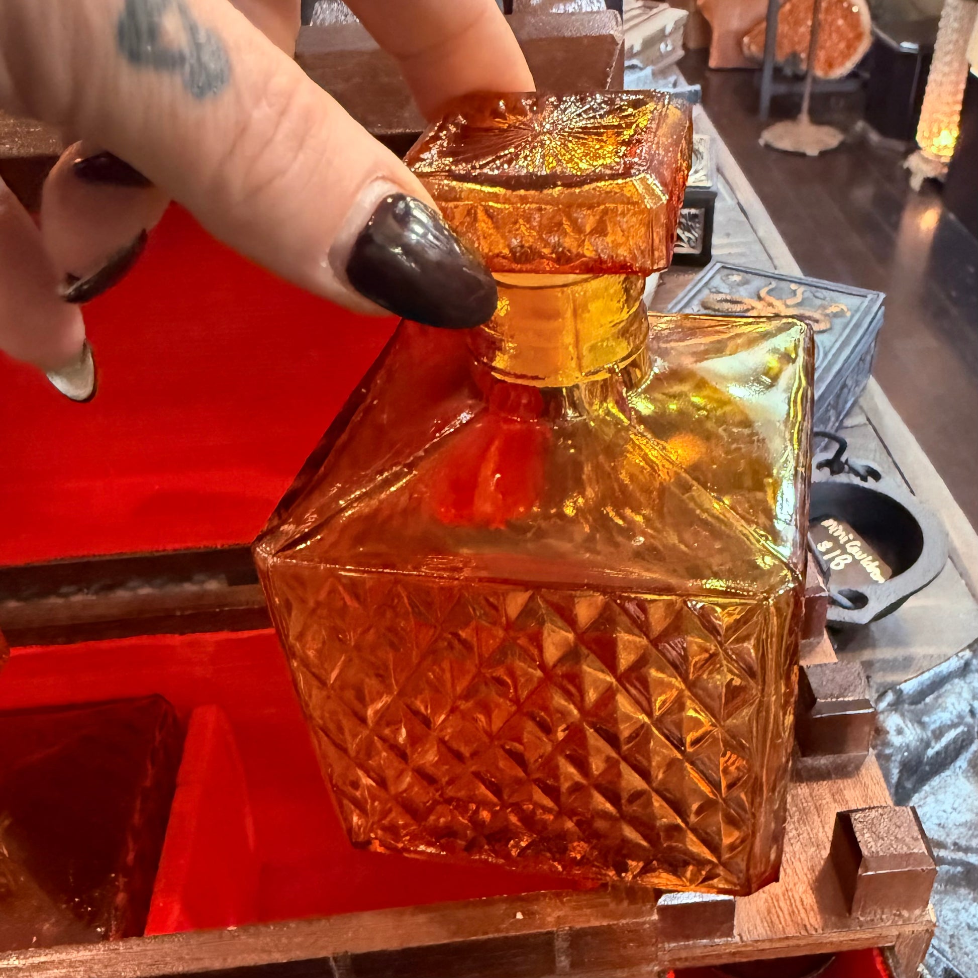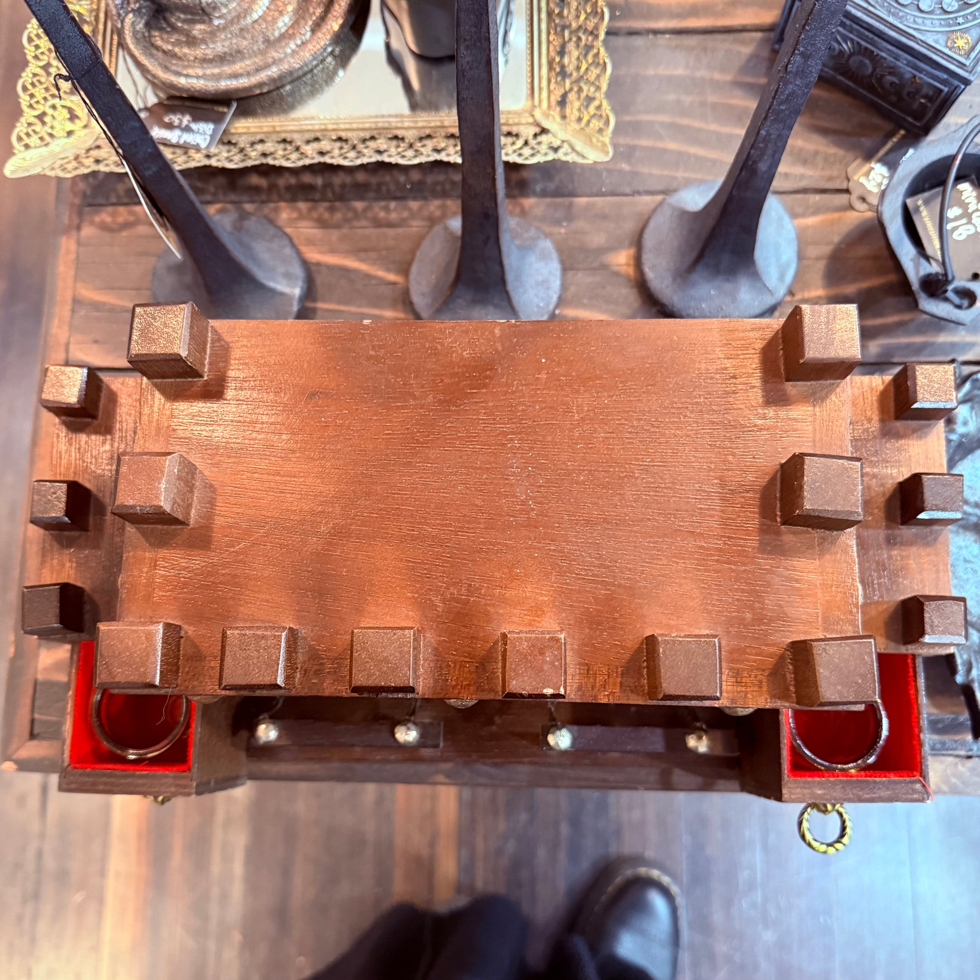 Vintage dark wood castle decanter set in great condition, complete with 4 shot glasses. Two decanters tuck inside wooden castle, it all closes up and hides away! Measures approx 12” wide.